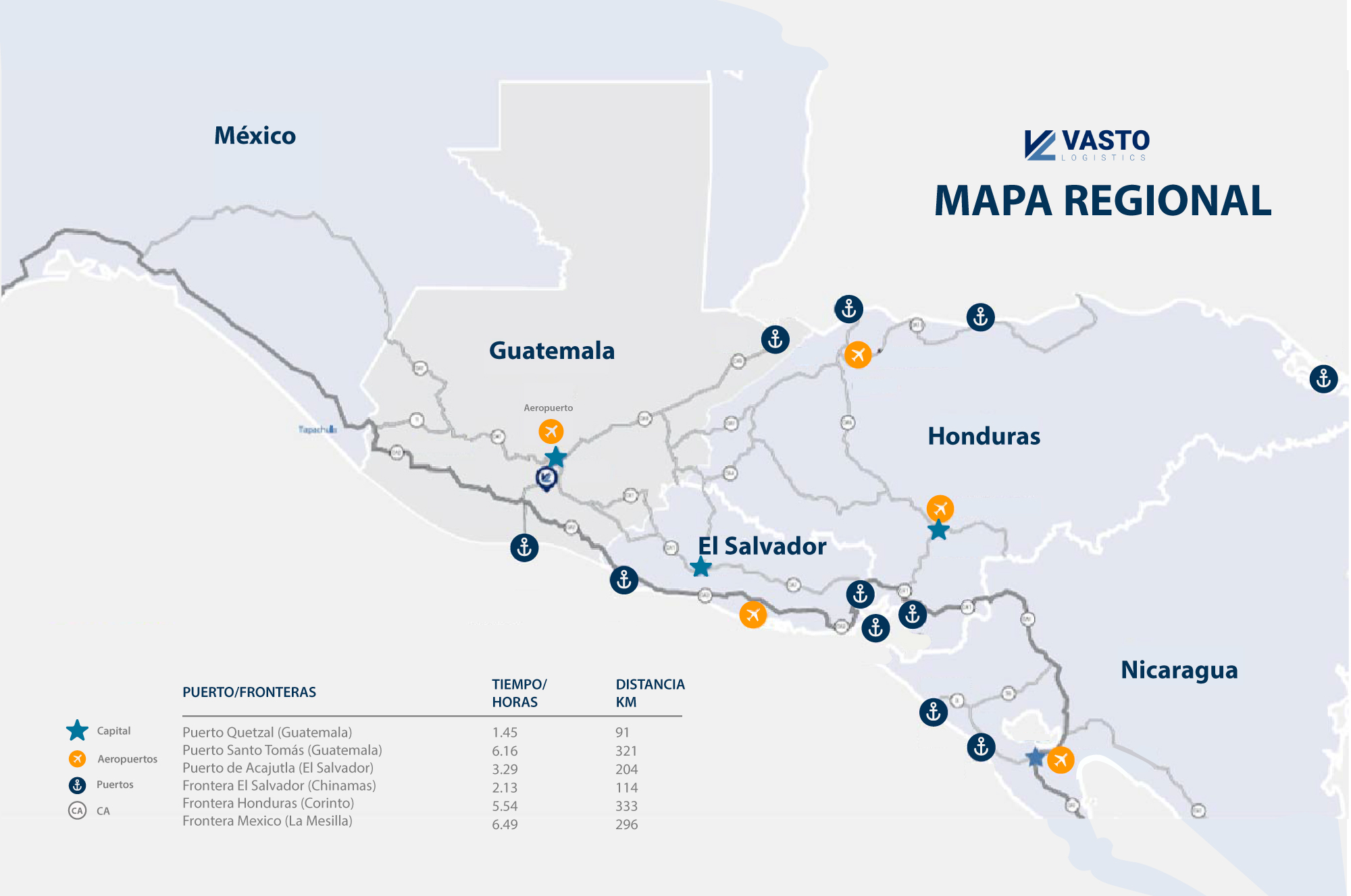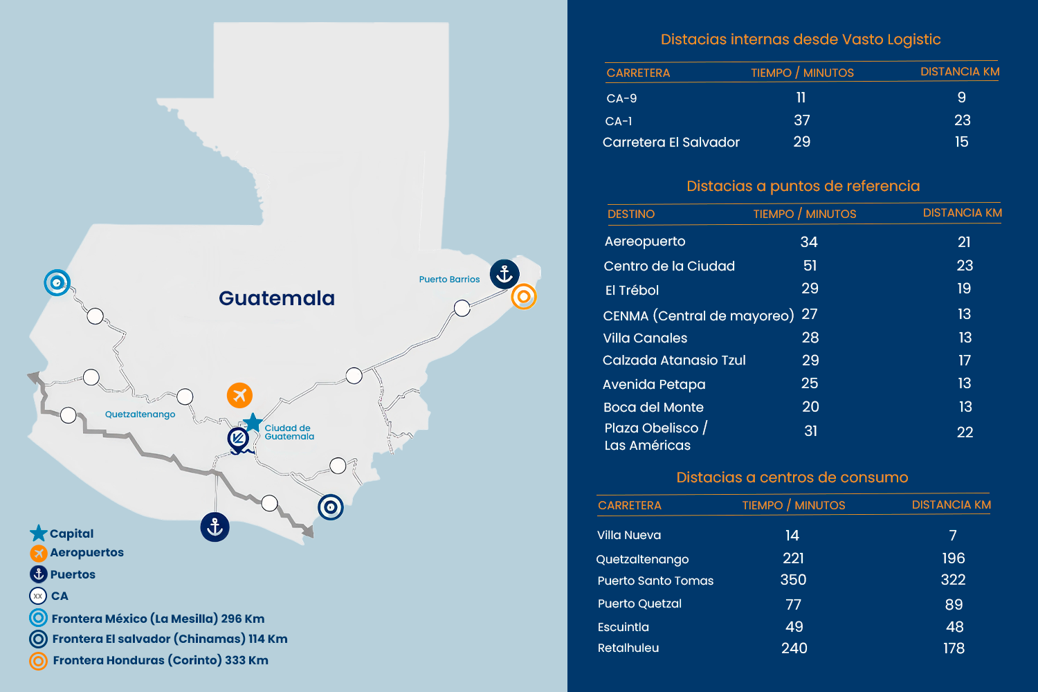 VASTO Logistics, está ubicado en Villa Nueva, zona 4, con acceso directo a la Vía Alterna al Sur (VAS), lo que permite una conexión eficiente con las principales rutas comerciales del país: CA‑9, CA‑1 y vías secundarias como Calzada Aguilar Batres, Atanasio Tzul y San Miguel Petapa.